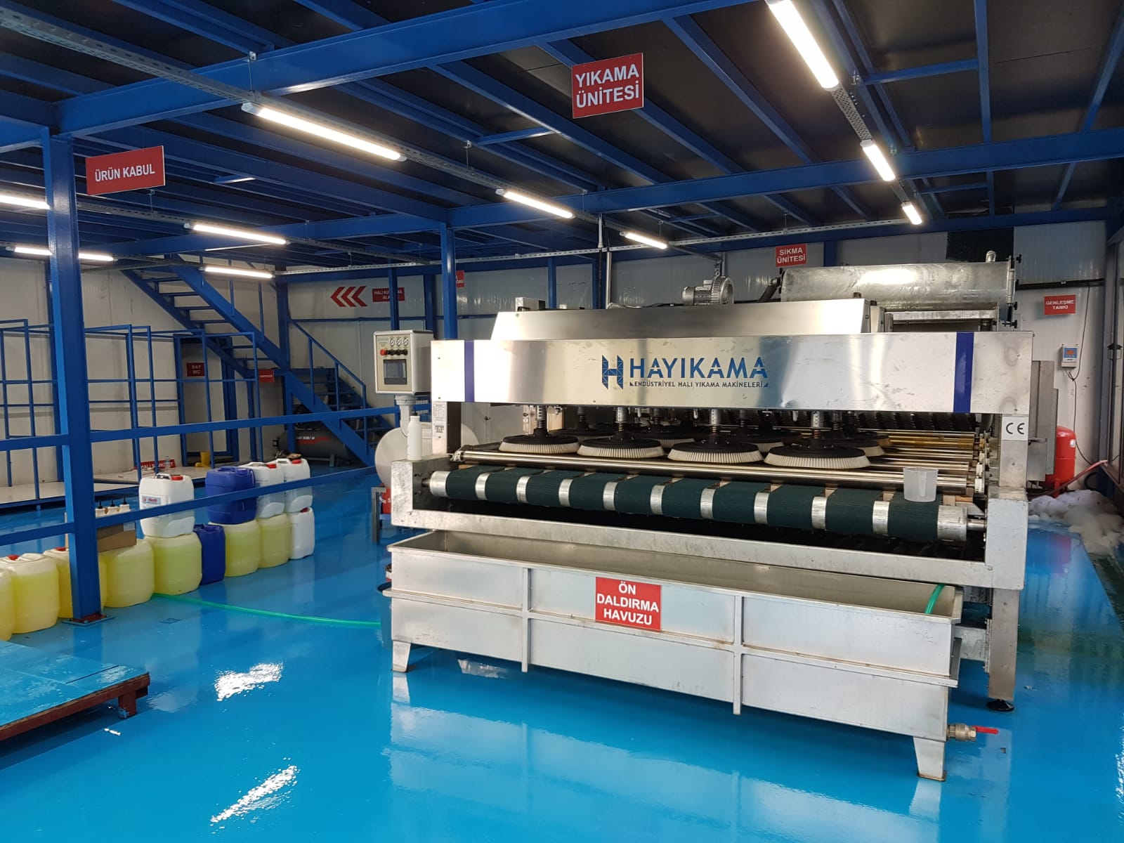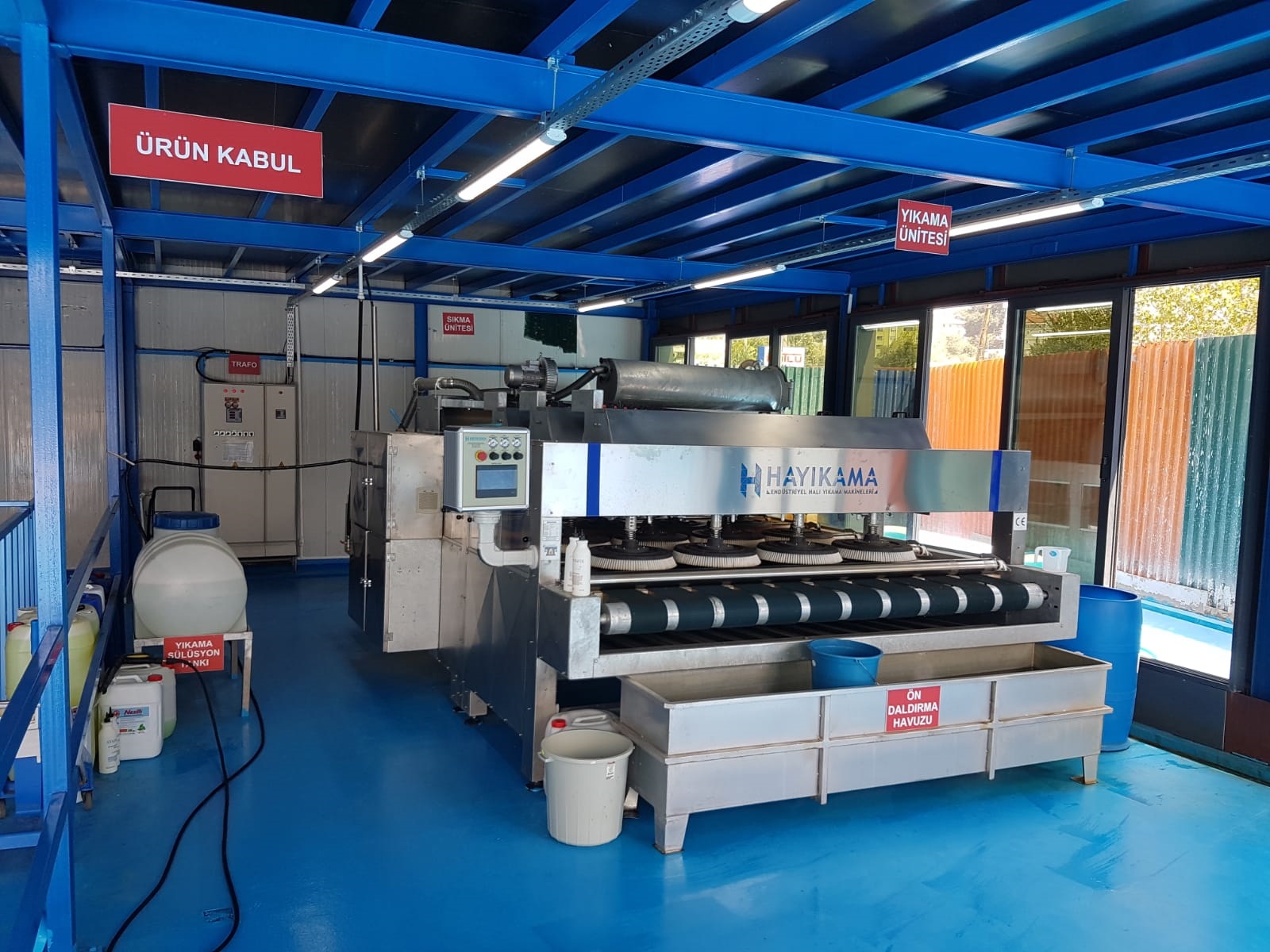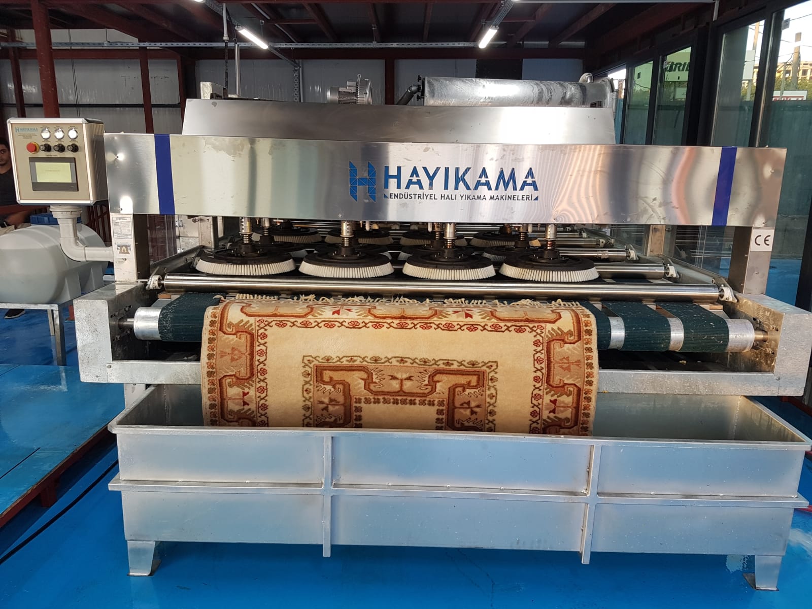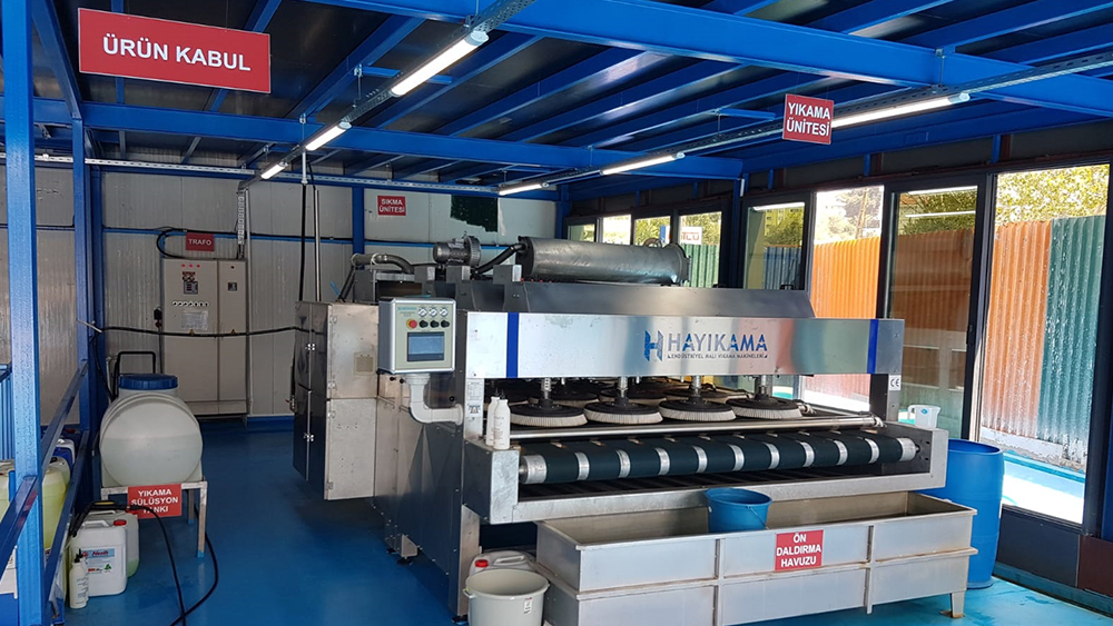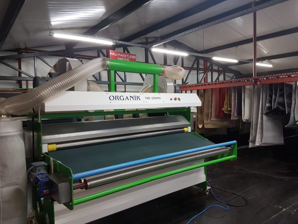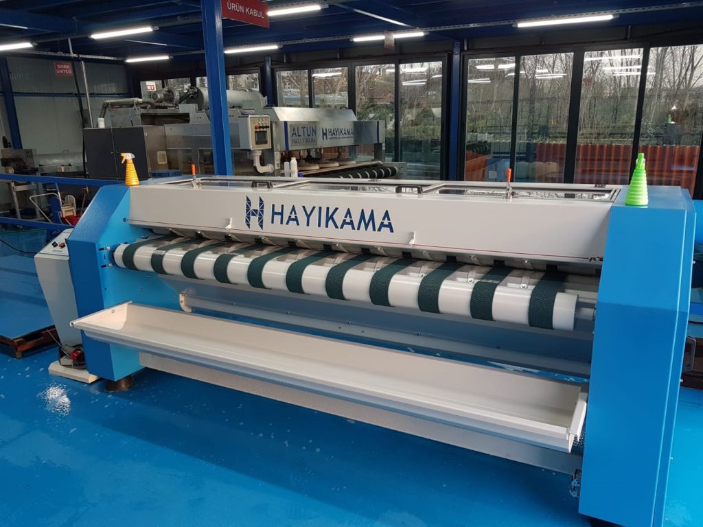Kemerburgaz Halı Yıkama Fabrikasında yeni sistem tam otomatik halı yıkama makinasıyla halılar tek tek, eşit su ve organik şampuanlarla yıkanmakta, yıkama kalitesi el makinalarında olduğu gibi yıkayan kişinin insiyatifine bırakılmamaktadır.